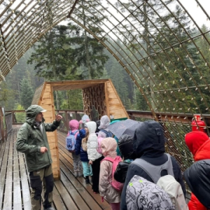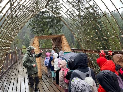 We wtorek 7.10.2025 r. klasy drugie wybrały się na wycieczkę krajoznawczo-turystyczną. Celem była "BRAMA w GORCE". Brama w Gorce to przyrodniczo-edukacyjna ścieżka poprowadzona wśród koron drzew. Oprócz możliwości podziwiania malowniczej doliny potoku Kowaniec z poziomu koron drzew, przemierzając ścieżkę edukacyjną, mogliśmy zaczerpnąć wiedzy przyrodniczej, kulturowej i historycznej podhalańskiego regionu, którą przybliżył nam pan przewodnik. Weszliśmy też do jaskini oraz braliśmy udział w ciekawych warsztatach „Las i ja”, na których przez mikroskop oglądaliśmy materiały zebrane w lesie i własnoręcznie wykonaliśmy pamiątki. Mimo niezbyt sprzyjającej pogody wycieczka była bardzo udana.