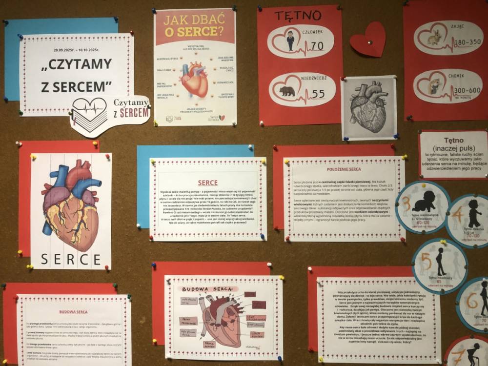 Już po raz drugi nasza biblioteka szkolna wzięła udział w V edycji Ogólnopolskiej Akcji Czytelniczej „Czytamy z Sercem”. Akcja zainicjowana z okazji Światowego Dnia Serca oraz Ogólnopolskiego Dnia Głośnego Czytania trwała od 29 września 2025r. do 10 października 2025r. Celem akcji było propagowanie czytelnictwa ale także szerzenie wiedzy o sercu i profilaktyka chorób serca. Z tej okazji uczniowie z klas młodszych mogli wysłuchać głośnego czytania opowiadania pt. „Serce w klatce” z książki A. Struskiej- Musiał „W rytmie serca”, obejrzeć film o ludzkim sercu, posłuchać bicia serca za pomocą stetoskopu oraz odbyć tematyczne zajęcia plastyczne. Nasi uczniowie wzięli również udział w szkolnym konkursie plastyczno-czytelniczym na zakładkę do książki pt. „Bohater o wielkim sercu – bohater literacki”. Na etapie szkolnym w konkursie wzięło udział 30 prac plastycznych a najpiękniejsze prace zostały wysłane na ogólnopolski konkurs plastyczny o tym samym tytule.