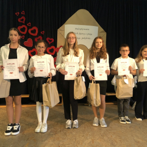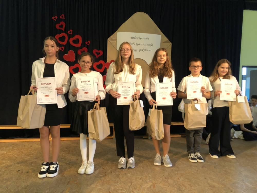 Zwycięzcy konkursu podczas akademii w dniu 9 października 2025r. otrzymali pamiątkowe dyplomy i nagrody rzeczowe ufundowane przez Radę Rodziców naszej szkoły.