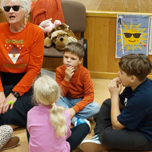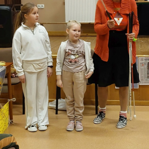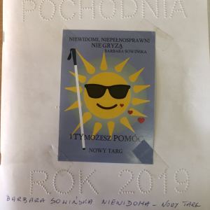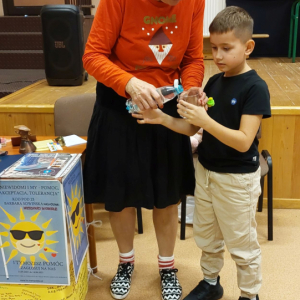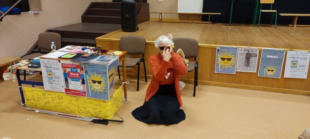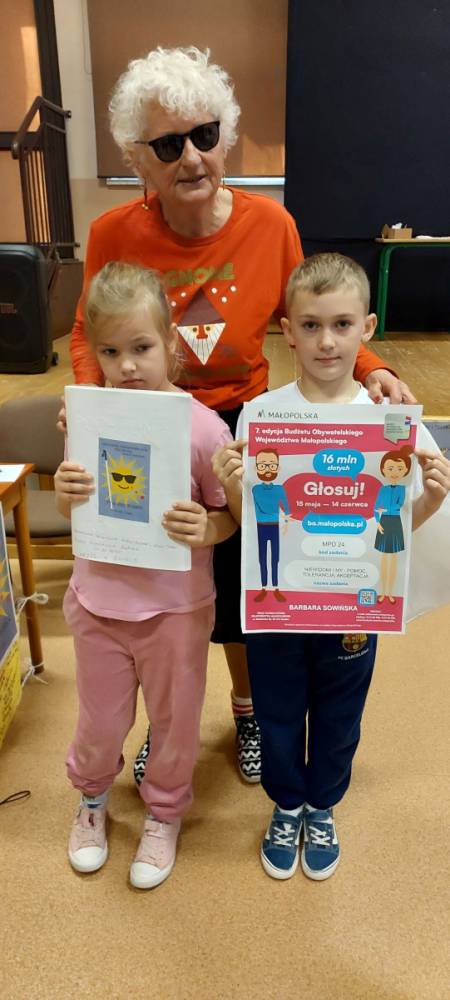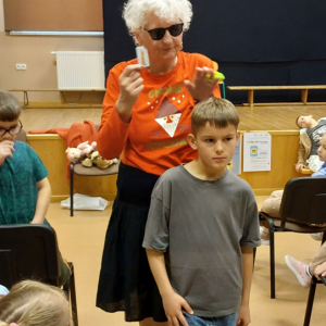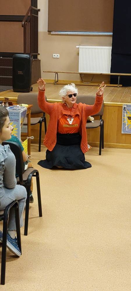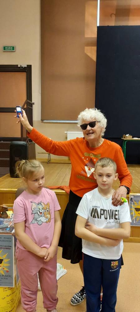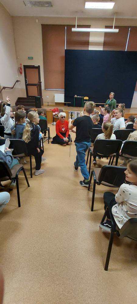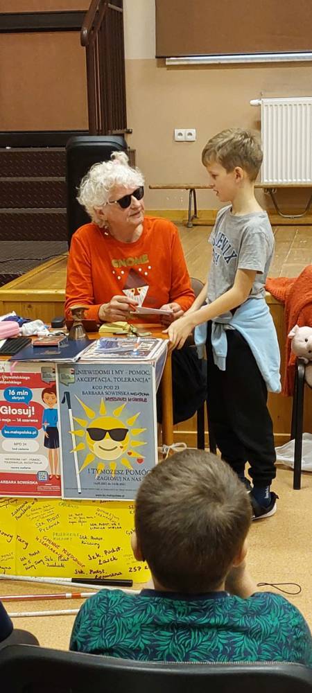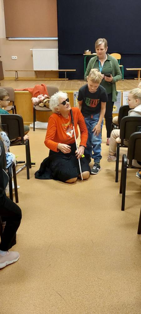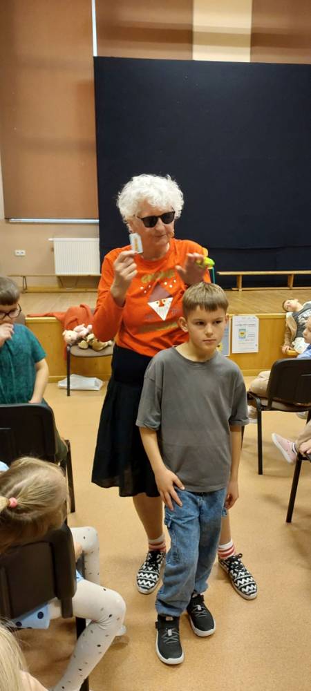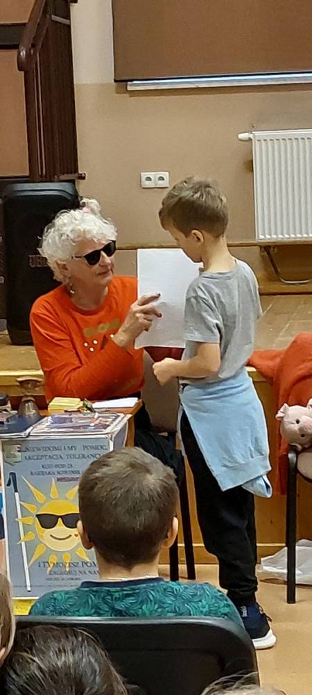 Pani Barbara, która wskutek choroby straciła wzrok, pokazała dzieciom, że ludzie niewidomi również potrafią czytać, pisać, poruszać się po ulicy, a nawet pomagać innym. Pani Sowińska przedstawiła uczniom, jak wygląda codzienne życie i funkcjonowanie osób niewidomych w społeczeństwie. Dzieci miały szansę zobaczyć rekwizyty służące osobom niewidomym, jak książki, tabliczki do pisania, alfabet Braille'a, czy specjalny zegarek. Mogły też spróbować, jak poruszać się z pomocą laski, rozpoznawać przedmioty za pomocą dotyku i węchu. Pokazała im, jak pomagać tym ludziom, aby pomoc była właściwa. Zapoznała naszych uczniów z alfabetem Braila pokazała, jak dzieci niewidome uczą się matematyki, jak posługują się laską podczas poruszania się i radzą sobie w wielu innych sytuacjach. Nasi uczniowie aktywnie uczestniczyli w spotkaniu.