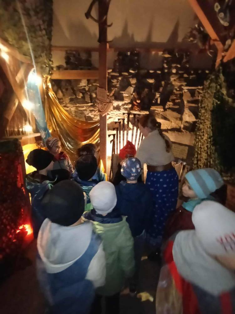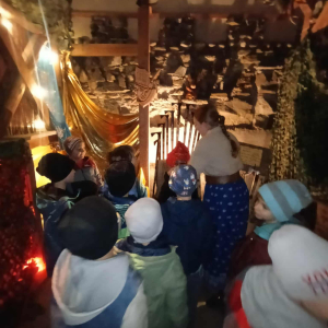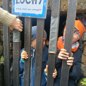 Następnie uczniowie przeszli do „jaskini zbójników”, gdzie pani przewodnik opowiadała o zbójnikach – kim byli, jak żyli i czym zajmowali się na co dzień. W tym miejscu odbyło się uroczyste pasowanie na zbójnika, które było pełne radości i emocji.