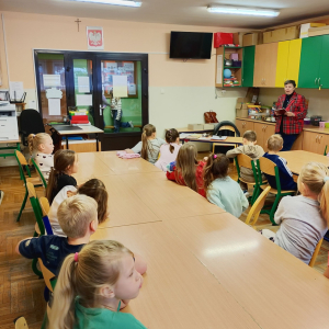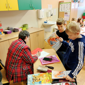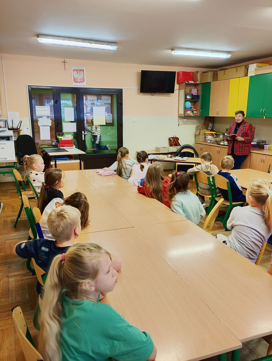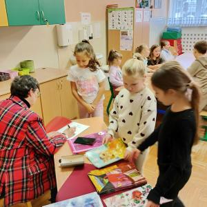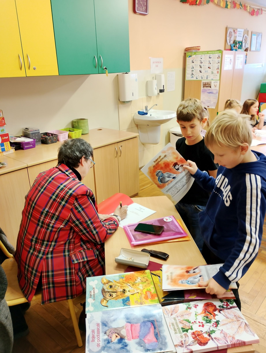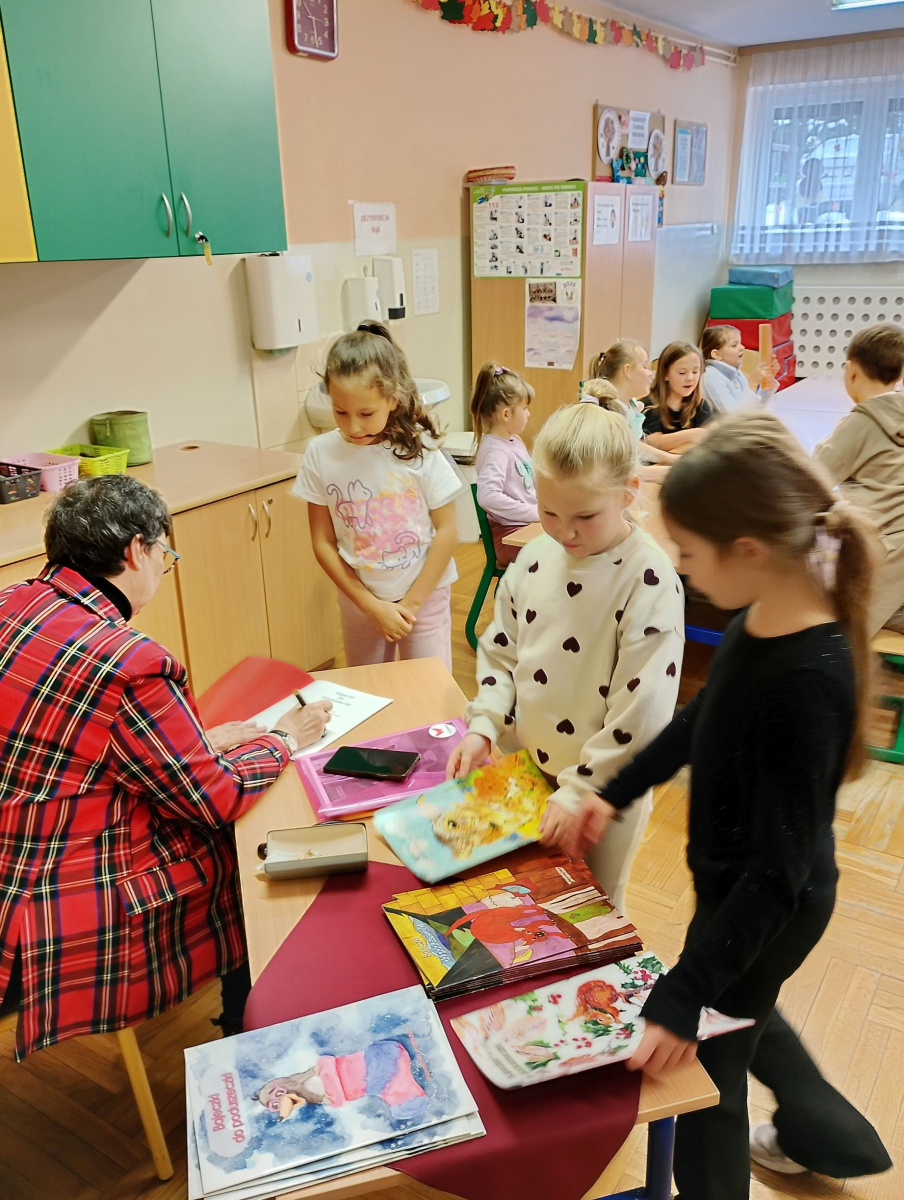 We czwartek 26 listopada 2025r. w naszej szkole miało miejsce spotkanie autorskie z p. Jolantą Kobielą-Gurgul - pisarką, autorką bajek z morałem dla dzieci. W wydarzeniu uczestniczyli uczniowie klas pierwszych i trzecich. Celem spotkania było przede wszystkim rozwijanie zainteresowań czytelniczych ale także budowanie więzi między twórcami a czytelnikami poprzez bezpośredni kontakt. Pani Jolanta opowiedziała dzieciom jak powstają jej książki, od pierwszej myśli w głowie autora aż po drukarnię, podkreślając jednocześnie jak ważną rolę w tworzeniu odgrywają obserwacje otaczającego nas świata i wyobraźnia. Uczniowie dowiedzieli się co to jest rękopis i wydawnictwo oraz kto rysuje ilustracje do książek. Autorka przeczytała także fragment jednej ze swoich wielu bajek. Na zakończenie tego niezwykle ciekawego spotkania każdy wybrał książeczkę z osobistą dedykacją od autorki.