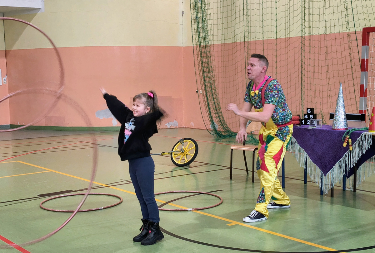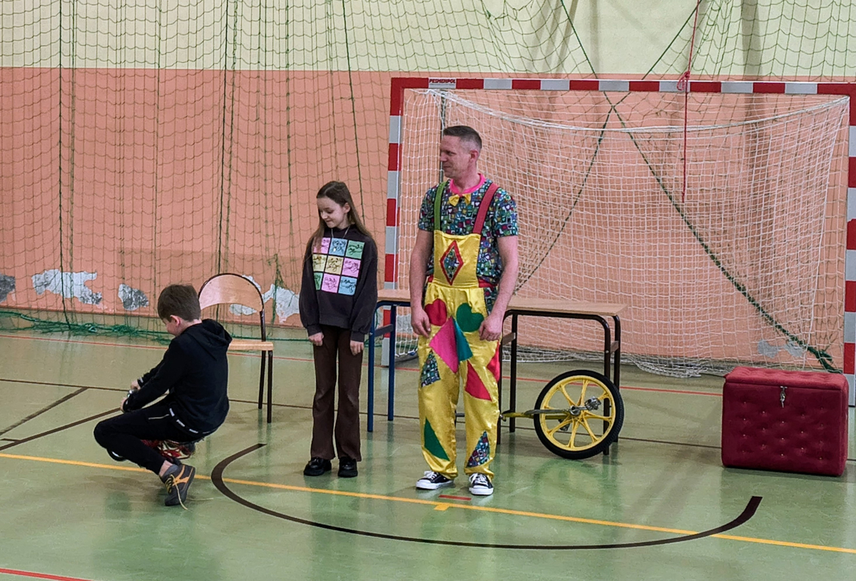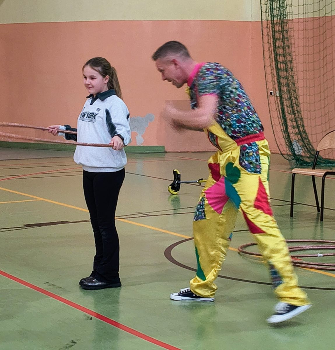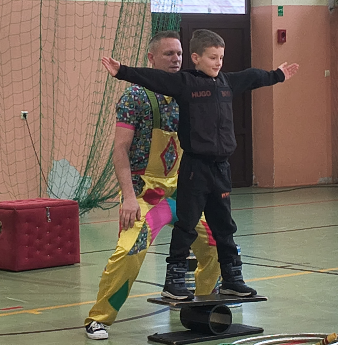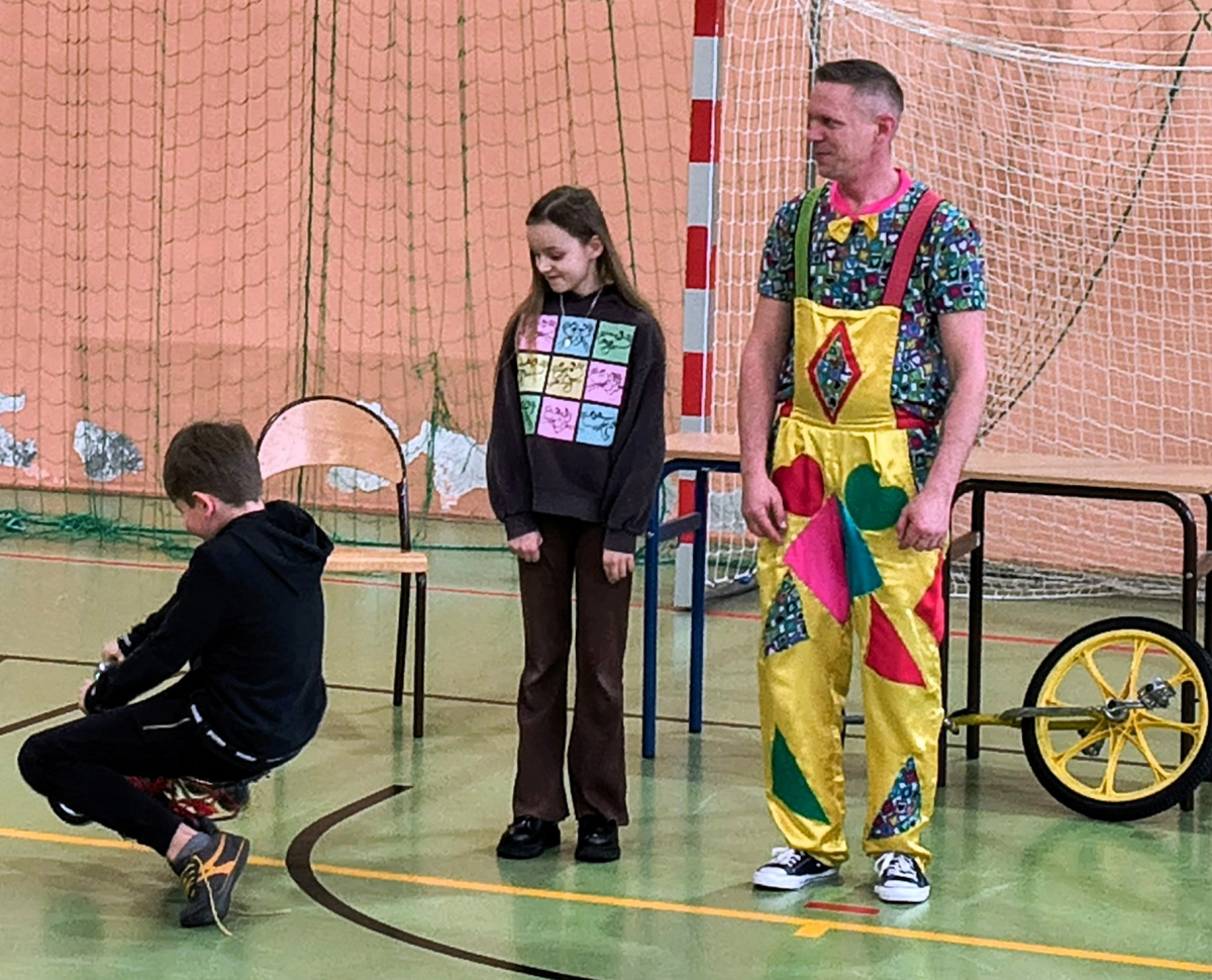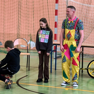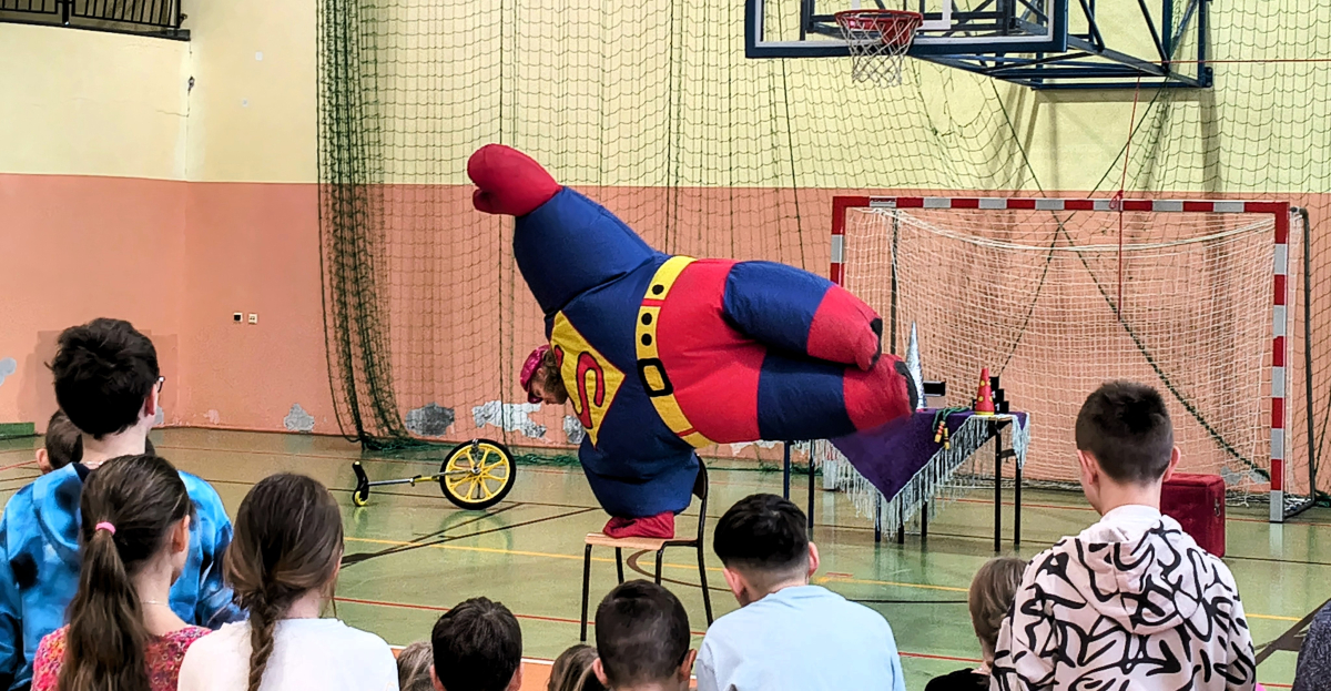Tuż przed feriami, we czwartek 29 stycznia 2026r., gościliśmy w naszej szkole ukraińskich artystów z mobilnego „Cyrku Szok”. Cyrk ten regularnie odwiedza polskie szkoły, oferując interaktywne pokazy dla dzieci, zapewniając rozrywkę i umożliwiając uczniom udział w prostych sztuczkach, generując niesamowite wrażenia i gromkie brawa. Tak też było podczas czwartkowego pokazu, kiedy to młodsi uczniowie z klas I-IV mieli okazję wcielić się w prawdziwych akrobatów, obejrzeć sztuczki iluzjonistyczne i akrobatyczne. Przed naszą publicznością wystąpił między innymi wesoły klaun, miś polarny oraz dmuchany Spiderman. Spotkanie przebiegało w atmosferze znakomitej zabawy i mnóstwa wrażeń.