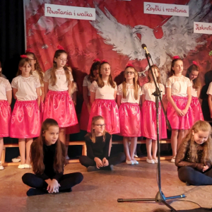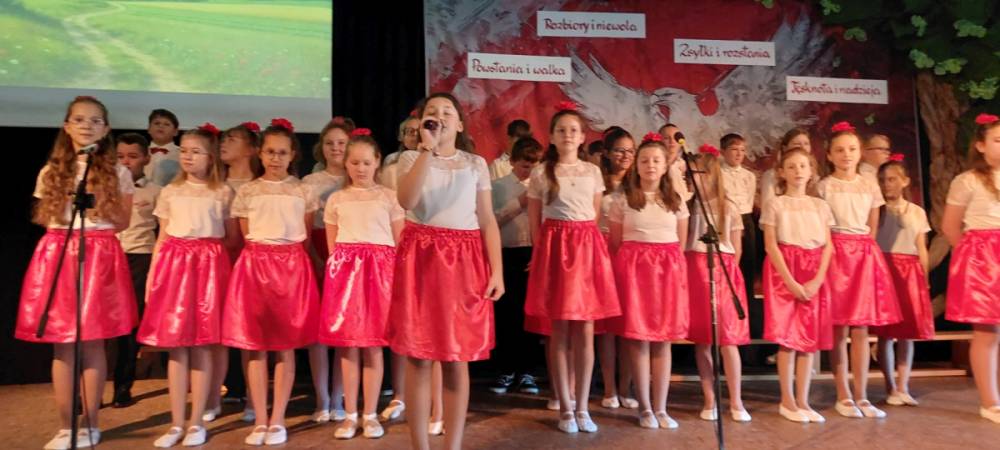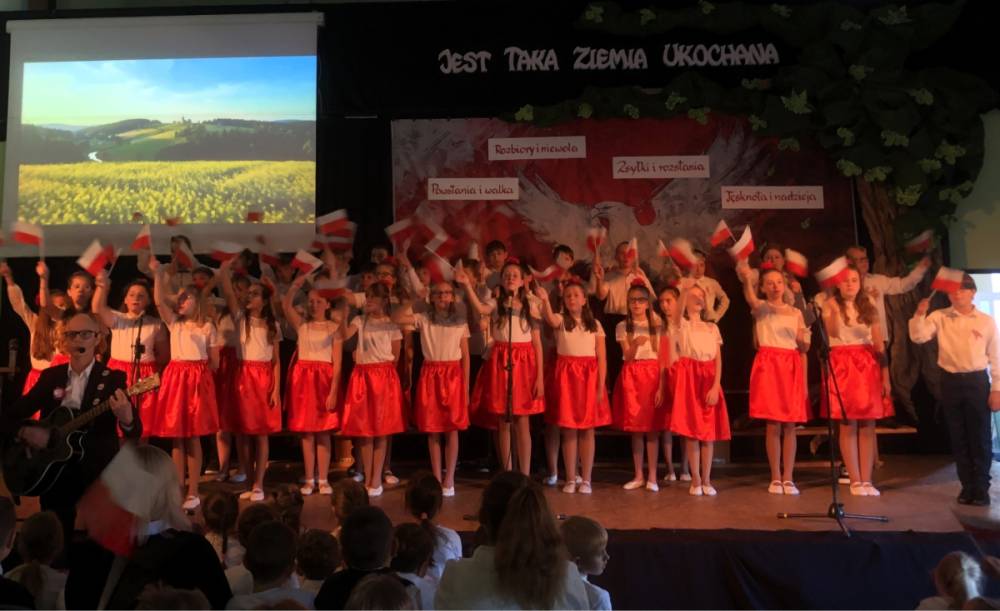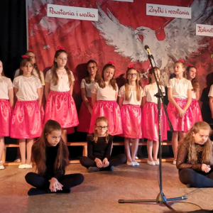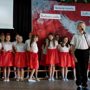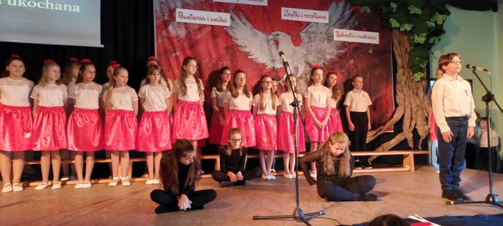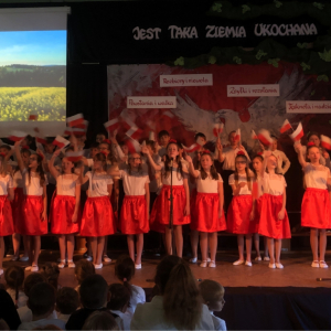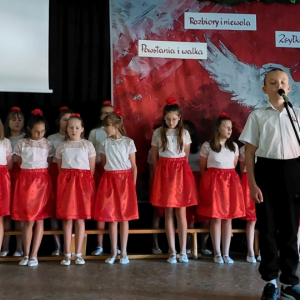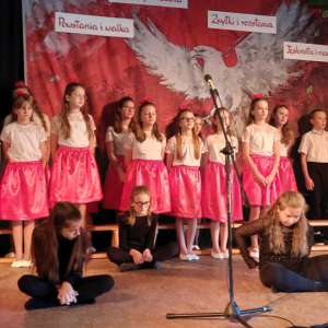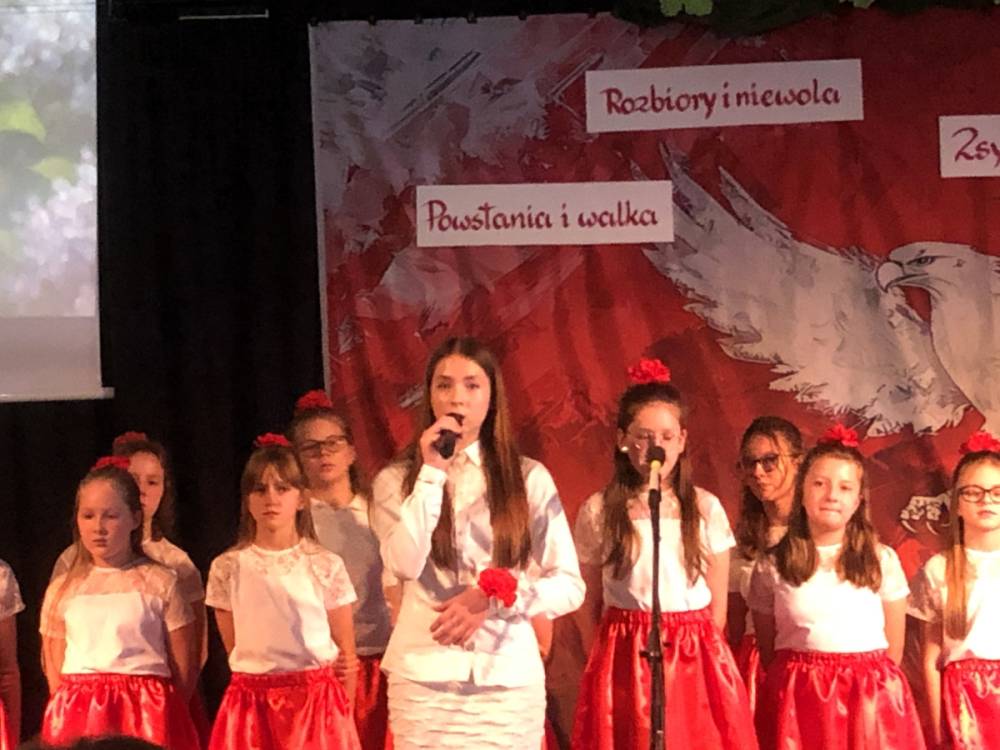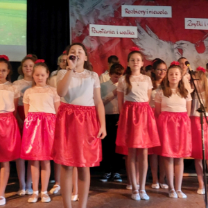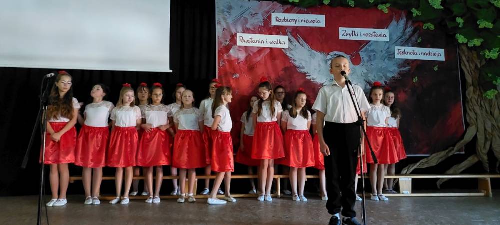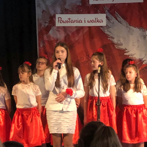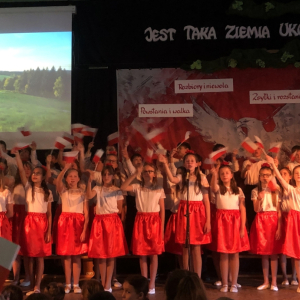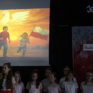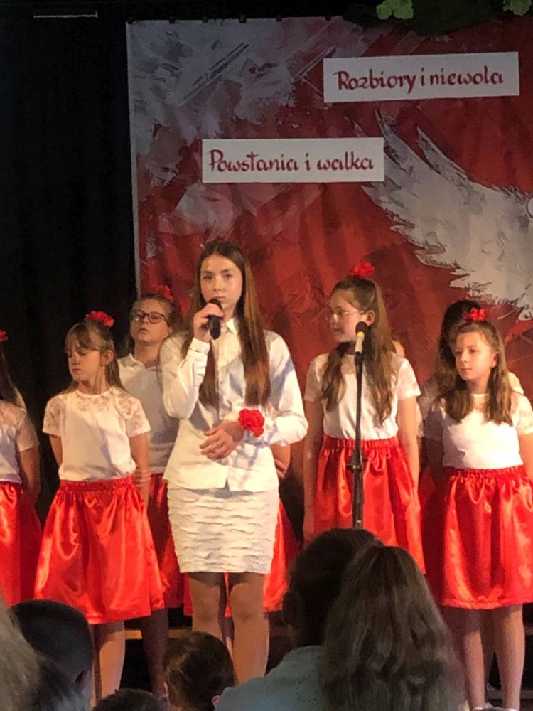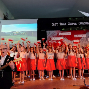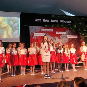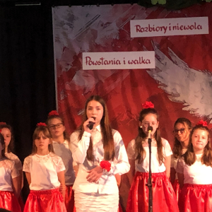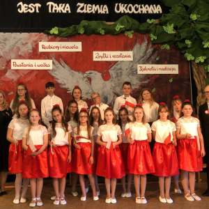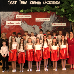 Piątoklasiści ubrani w biel i czerwień przedstawili społeczności szkolnej montaż słowno-muzyczny - recytowali wiersze i śpiewali przepiękne nasze polskie pieśni patriotyczne, zarówno w wykonaniu solistów, jak i zespołowym. Na zakończenie akademii, dyrektor szkoły Pani Bernadeta Jakubiak podziękowała wychowawcom i uczniom za doskonałe przygotowanie akademii oraz całej społeczności szkolnej za wspólne świętowanie, pełne radości i patriotycznego ducha, który zawsze nas łączy. Uczciliśmy tym samym pamięć wielu pokoleń Polaków, bohatersko walczących za nasz kraj i jego wolność, w myśl odwiecznego hasła: Bóg – Honor – Ojczyzna.