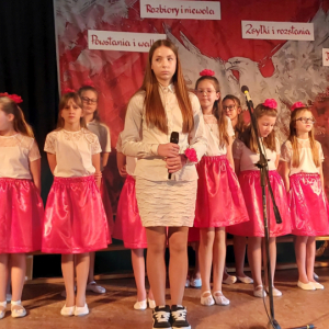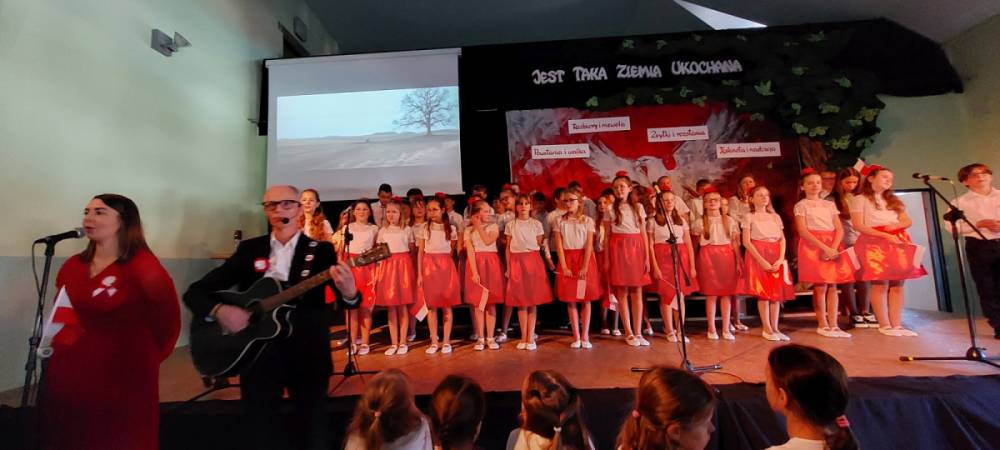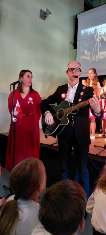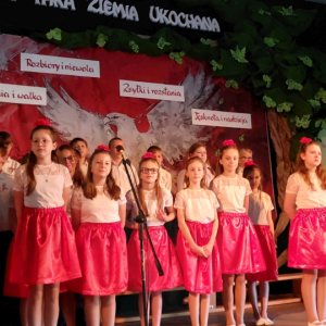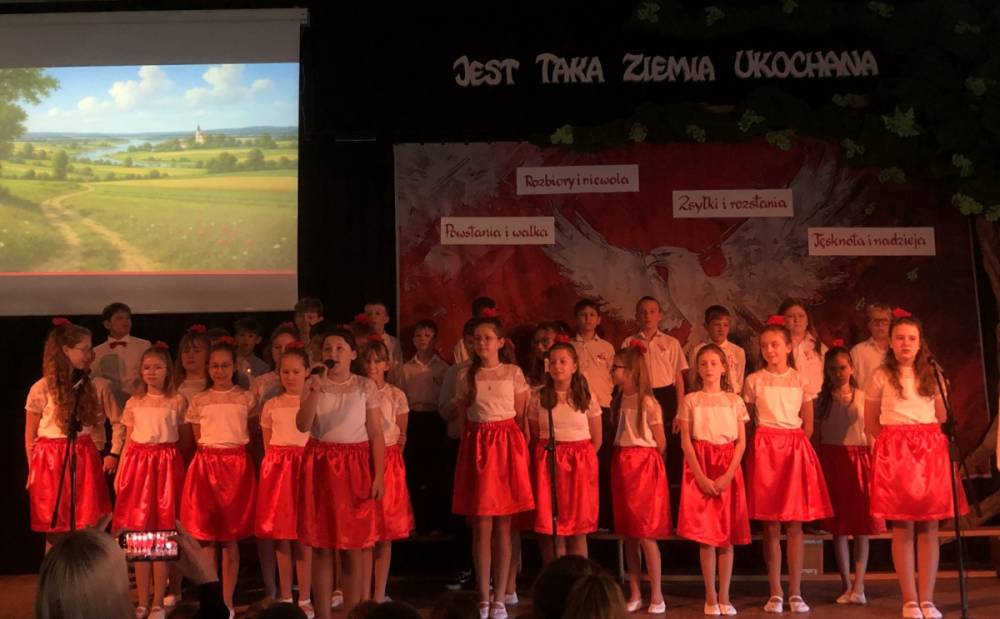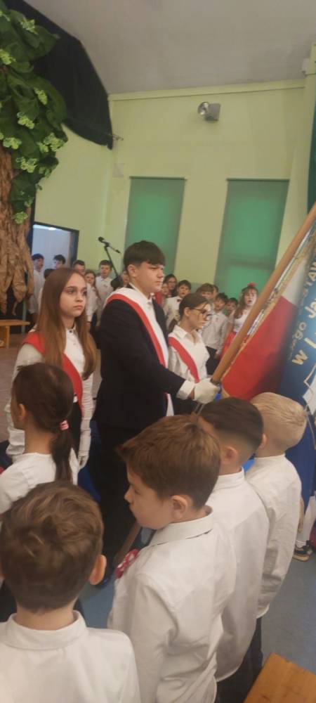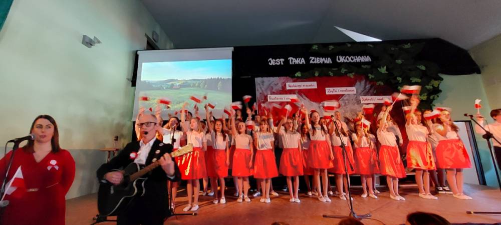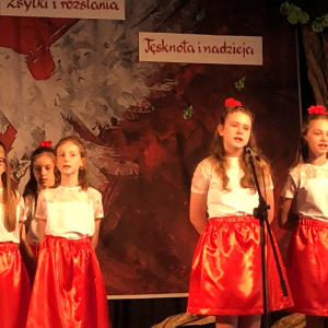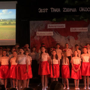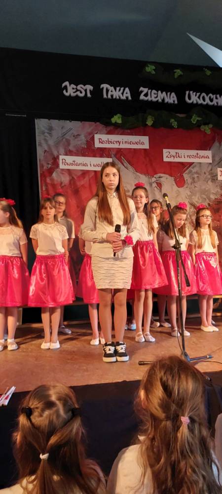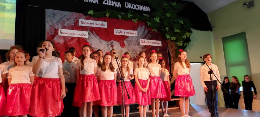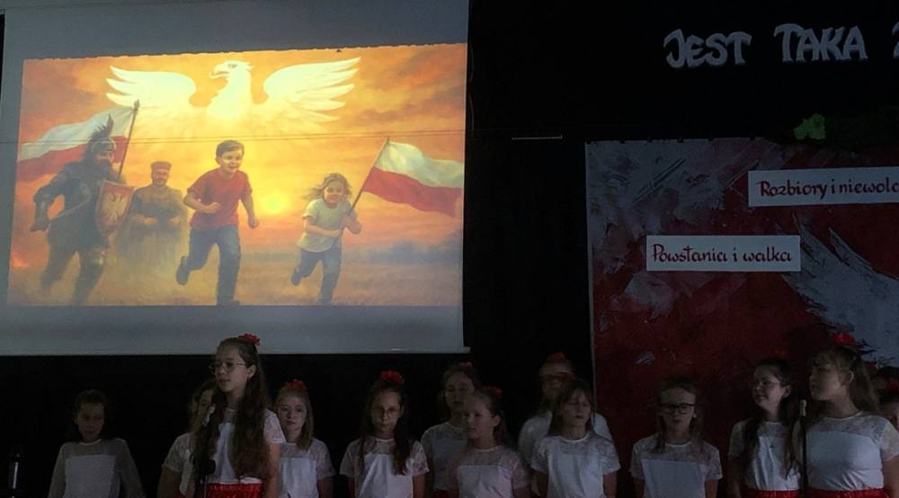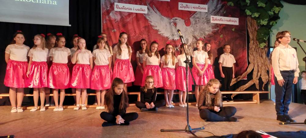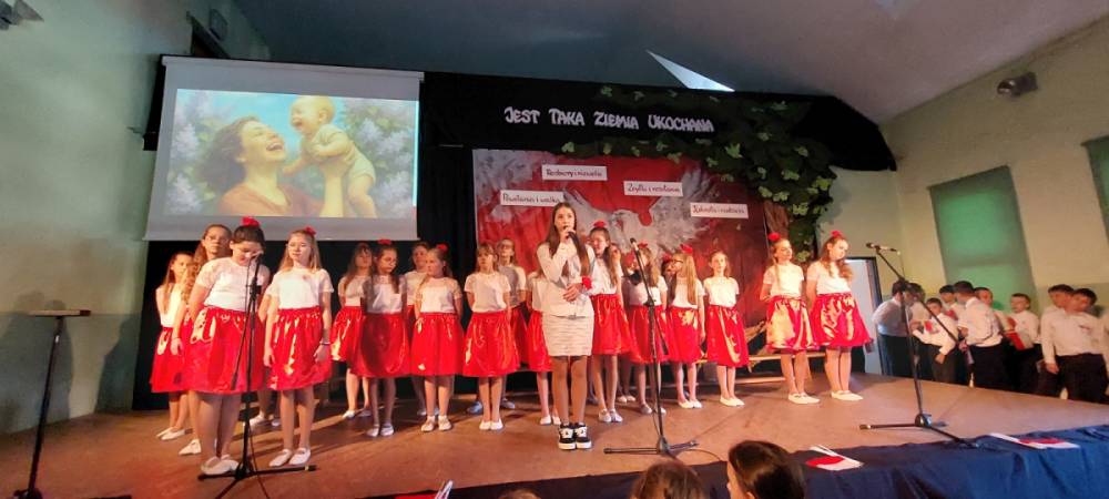 Piątoklasiści ubrani w biel i czerwień przedstawili społeczności szkolnej montaż słowno-muzyczny - recytowali wiersze i śpiewali przepiękne nasze polskie pieśni patriotyczne, zarówno w wykonaniu solistów, jak i zespołowym. Na zakończenie akademii, dyrektor szkoły Pani Bernadeta Jakubiak podziękowała wychowawcom i uczniom za doskonałe przygotowanie akademii oraz całej społeczności szkolnej za wspólne świętowanie, pełne radości i patriotycznego ducha, który zawsze nas łączy. Uczciliśmy tym samym pamięć wielu pokoleń Polaków, bohatersko walczących za nasz kraj i jego wolność, w myśl odwiecznego hasła: Bóg – Honor – Ojczyzna.